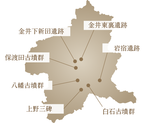 すべて国指定特別史跡。三碑は相互に関連性が深く、朝鮮半島の石碑文化、中国の政治制度や漢字文化、インドの仏教文化などの影響がうかがえ、中央(近畿)から遠く離れた東国の上野国(群馬県)に、当時の先進文化が受容され、守られていたことを示しています。