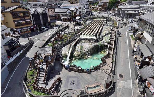 自然湧出量日本一で美肌効果も高い抜群の泉質を誇る草津温泉。「古くは恋の病以外ならどんな病気でも治る」と言われたとか。巨大な源泉、湯畑を中心に広がる温泉街で、周囲の広場は芸術家・岡本太郎氏がデザインしました。
