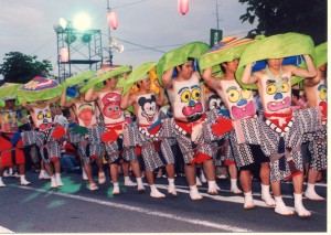 「へそ出せヨイヨイ」の掛け声とともに、お腹に絵を描いて踊る
