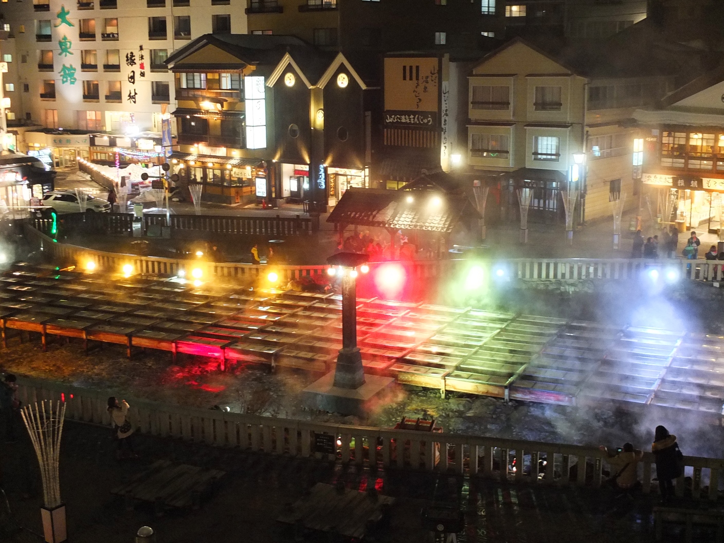 冬の湯畑を5色のライトで照らし、光と湯けむりが織りなす幻想的な空間をロマンチックに演出します。