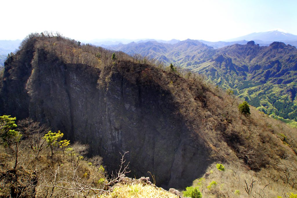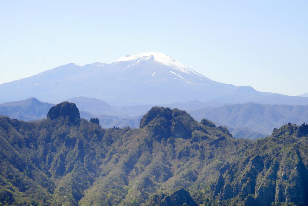 妙義山とは、白雲山、金洞山、金鶏山などからなる山々の総称であり、これを南側の“表妙義”と呼んでいます。その一方、妙義山の北側に位置する御岳、丁須の頭(ちょうすのかしら)、赤岩、烏帽子岩(えぼしいわ)、谷急山(やきゅうやま)などからなる山々は”裏妙義“と呼ばれています(上画像)。