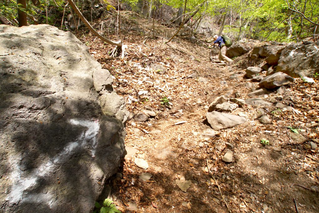 妙義山では、登山ルート上に案内標識や目印となるピンク(蛍光)テープ、ペイントで描かれた矢印表記など随所に道標が設置されています。基本的に踏み固められたルートから外れなければ道に迷うことはないですが、実際に歩いてみると、道が崩れ、迷いやすい場面も多く直面します。