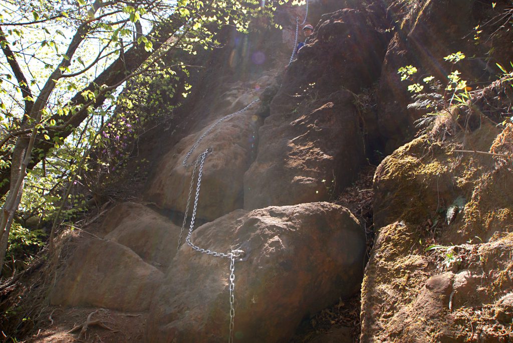 大の字の展望台の前に立ちはだかるほぼ垂直の鎖場。一瞬ひるみますが、慎重に足場を探し、岩登りの基本である「三点支持」を維持しながら、ゆっくり登りましょう。(雨天後は岩場が濡れて滑りやすくなっているため、より慎重に)