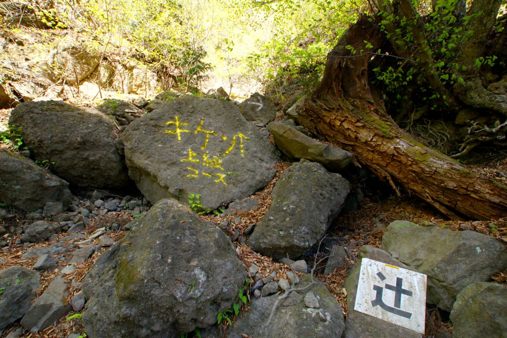 大の字からおよそ10分で次のポイント「辻」に到着します。ここから先は上級コース。「キケン」の文字がその先の険しさを物語ります。