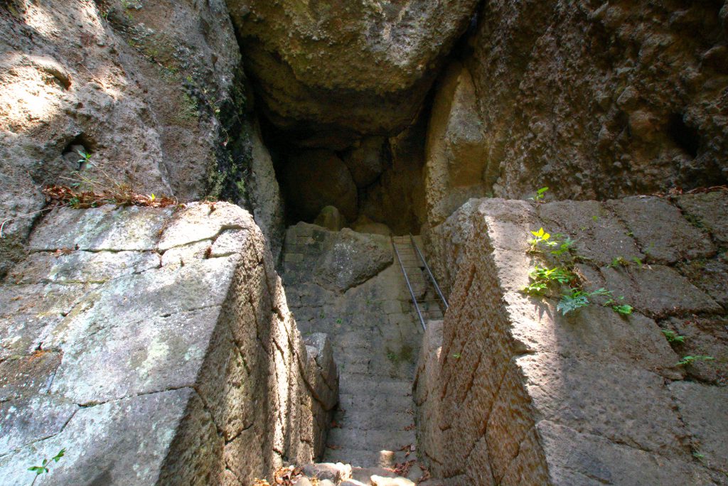 奥の院までは手彫りの階段や石段が続きます。15分ほどすると奥の院に到着。お堂の中のハシゴを登ると「中之嶽大国主命 白雲山妙義大神」などと刻まれた石碑や石仏らが祀られています。