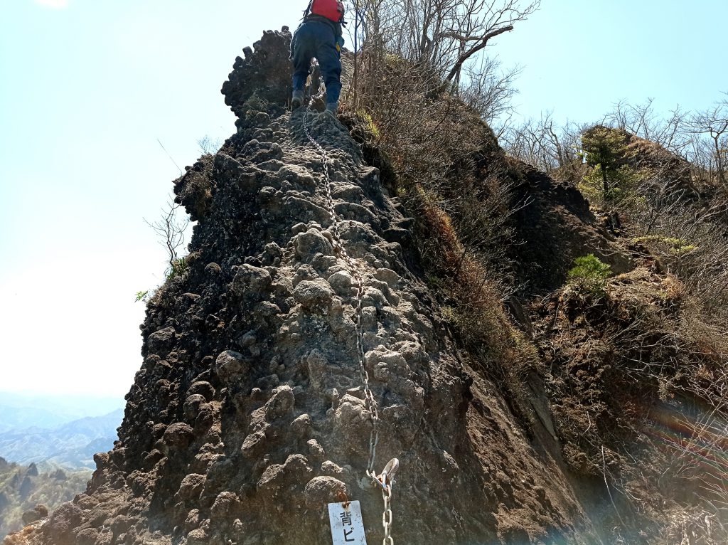 さらに急登は続き、最大の難所の一つといわれる「ビビリ岩」に差し掛かります。下から上が見えないエグい鎖場ですが、これも指示通り足を進めて何とかクリア。
