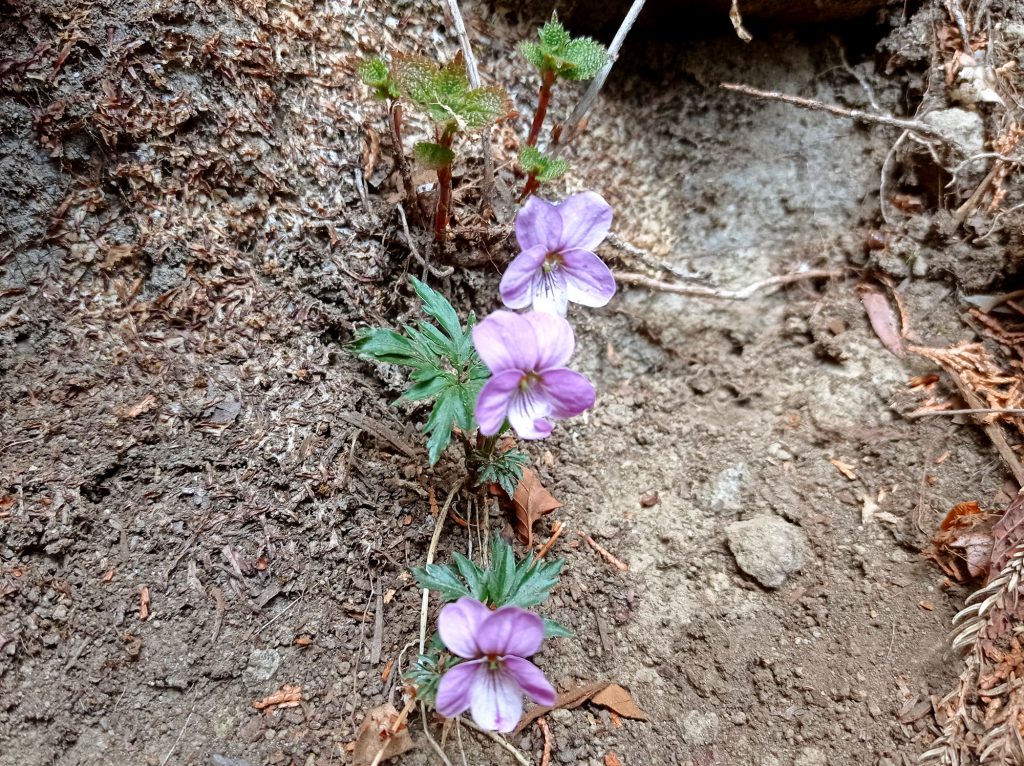 こちらはスミレの品種としては珍しい、ギザギザの葉っぱが特徴のエイザンスミレ。東北から九州まで広く分布し、湿った日陰を好んで成長します。“エイザン”は京都の比叡山から来ているとか。4~5月に多く見られます。