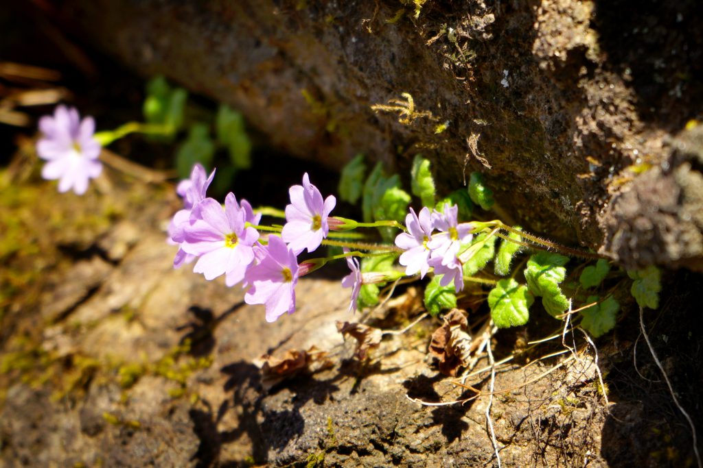 こちらは妙義山に咲く固有種「ミョウギコザクラ(妙義小桜)」。コイワザクラの変種で、葉に特徴があります。標高高い岩場に咲くことから、上級コースのチャレンジャーのみが見られる特別な花です。シーズンは4~5月です。