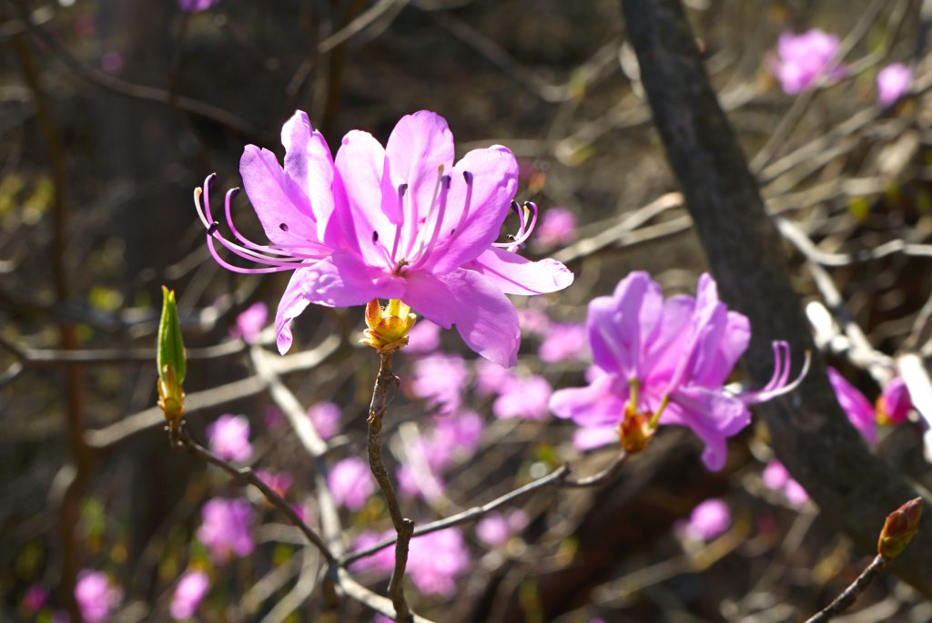 こちらは鮮やかなピンクの花を咲かせるミツバツツジ。ミツバツツジはおしべが5本で、トウゴクミツバツツジハは10本で区別できます。シーズンは4~5月。