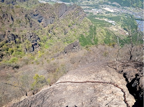 そうしていよいよ最大にして最後の難所ともいわれる大のぞきの三連30mの鎖場。下の画像ではわかりにくいですが、右上には大のぞきの欠けた石碑、そこから左下に向かって山の裂け目のように伸びる筋が鎖場です。降りるときは必死でしたが、改めて全容を知ると恐ろしいですね。