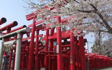 神社前には大小さまざまな鳥居が200基以上並び、商売繁盛のご利益を求めて多くの人で賑わいます。春には桜と鳥居のコントラストが美しく、写真映えスポットとしても人気です。